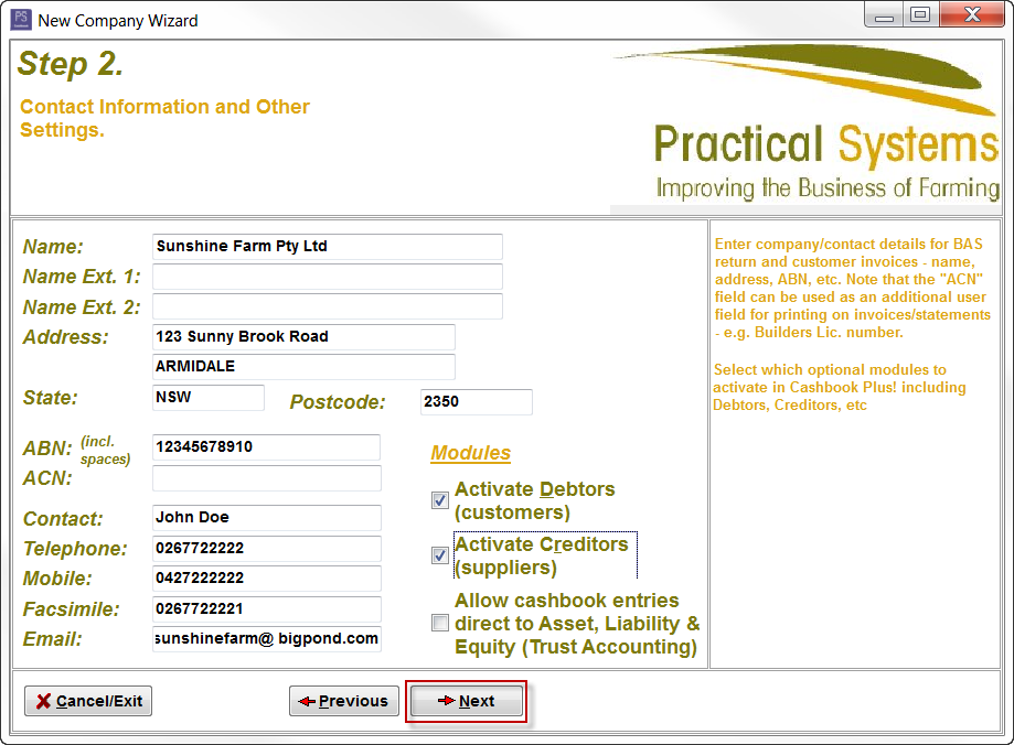 - Click Next to build the Cashbook Company File