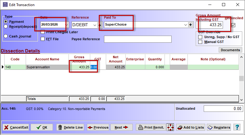 Check and change the dates up the top as they will default to 01/07/2025 for this first payment. The calculations will be done on the Date Paid, not the pay period.